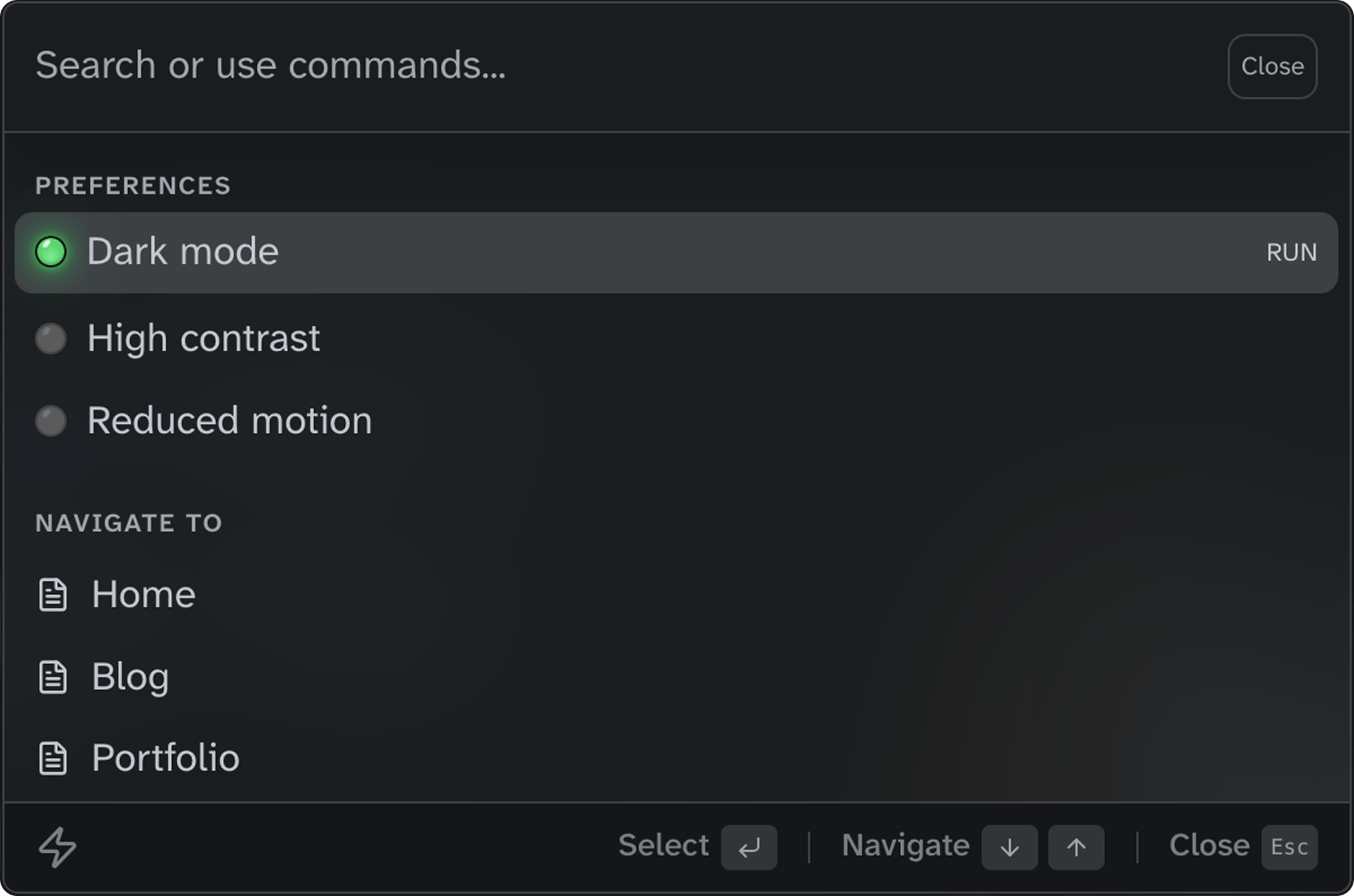 Open with Cmd/Ctrl+K, navigate with arrow keys, select with Enter, and close with Escape. No mouse required.